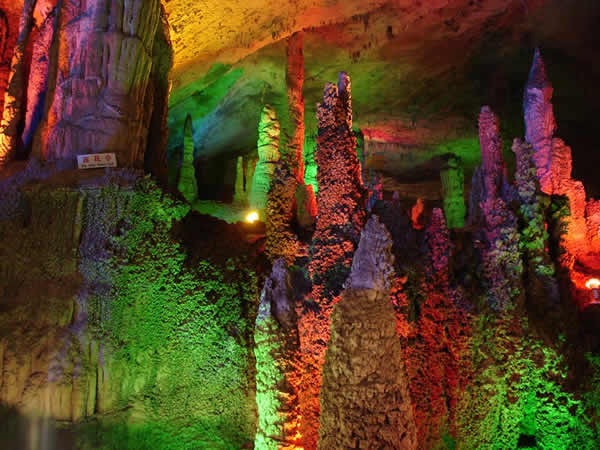 九天洞位于湖南張家界市桑植縣城17公里的利福塔鄉(xiāng),距市區(qū)70公里,距武陵源62公里,因洞內(nèi)有九個(gè)自然天窗九天洞而得名,總面積250公頃,是中國目前發(fā)現(xiàn)的溶洞之最,比號稱世界第一的利川溶洞大三倍。九天洞內(nèi)空氣清新,冬暖夏凉。整座洞穴分上、中、下三層,有五層不同高度的螺旋式觀景臺(tái),最下層低于地表面400多米。經(jīng)初步探明洞內(nèi)有40個(gè)大廳、3條落差懸殊的陰河、12條瀑布、5座自生橋、10余座洞中山,此外,還有不可勝數(shù)的五光十色的鐘乳石群。在眾多迷人的景觀中尤以九星山、玉宮、水晶宮、九天玄女宮、壽星宮五大奇觀最為著名。