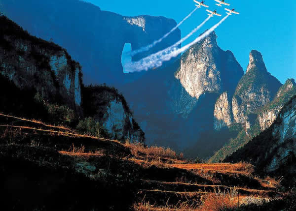 1700多年來,這一道奇絕天下的勝景吸引著無數(shù)的探訪者趨之若鶩。特別是在1999年,世界特技飛行大師駕機(jī)穿越天門洞,在全球引發(fā)了轟動效應(yīng),收看現(xiàn)場直播的觀眾達(dá)到8億之多。