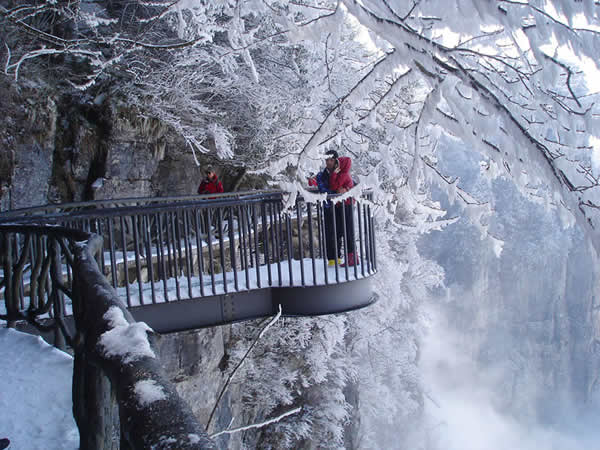 據(jù)施工人員介紹,此條棧道也是他們所修棧道中施工最難,最險(xiǎn)峻的一條。如果您還覺得不夠刺激的話,在棧道的完結(jié)處的兩個(gè)懸崖之間有一條長160米的懸索吊橋,同時(shí),在海拔最高點(diǎn)還有一個(gè)挑戰(zhàn)心里極限的玻璃站臺(tái),在這里,如果你能挺直腰板伸開雙臂,那么,您就是真正的勇士了。