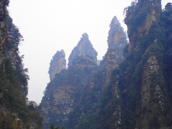 百丈峽圖片 凡到過索溪峪的人,都知道黃龍洞和寶峰湖,卻不一定知道那里還有個百丈峽。一個十分野氣的地方。是的 一級級不規(guī)則的坡田,傍著不被人注意的小山。山腳下蜿蜒一條溪流,幾乎看不到水。只憑一些雜亂的卵石才能辨認出來。那溪流的出山之處,便是百丈峽口。幾條既是田埂又兼小路的窄徑,將我引到峽口。啊!一下子眼界大開,驚喜得叫了一聲。好偉麗的山,好嵯峨的峰!縱目觀去,不遠的峽正中,一峰拔地豎起,似一條巨大的桿魚,頭在半空,尾藏溪中,蔚為壯觀,一下子便吸引了我。
