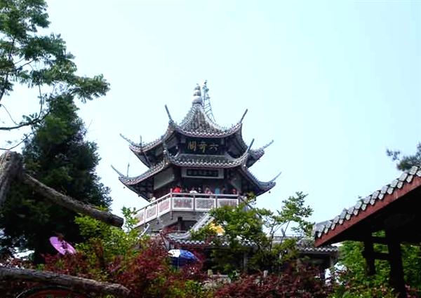 六奇閣位于張家界森林公園黃石寨項(xiàng)的人工建筑。因張家界國家森林公園”山奇、水奇、云奇、石奇.樹奇以及珍禽異獸之奇”而得名。閣分3層,黃瓦蓋頂,飛檐翹角,畫梁彩棟,回廊石欄。登閣憑眺,滿目佳景。閣柱楹聯(lián)日:“翠鬟煙籠,綠樹云封.昔日曾遮半個面:麗質(zhì)天生,畫圖省識,今朝始醉四方人!庇忠宦(lián)云“名動全球,到此實(shí)堪三擊掌:勢拔五岳,歸來不用再看山!遍w內(nèi)設(shè)有土家風(fēng)情歌舞樓.竟日絲竹弦管,清音繞梁。閣基嵌有《張家界國家森林公園記》全文碑刻。1995年9月8日.全國政協(xié)主席李瑞環(huán)登閣賞景。