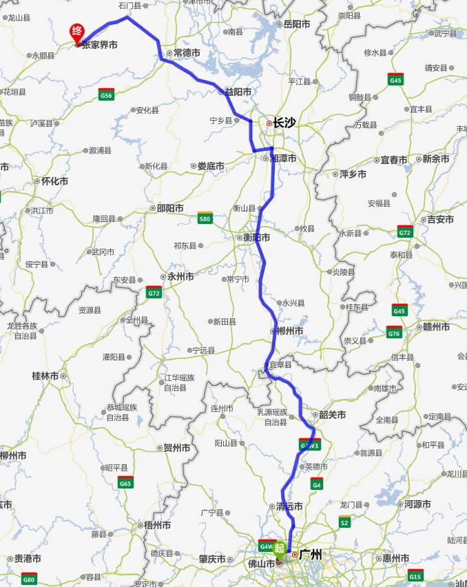 左右,沿途經過佛山——廣州市——清遠——英德市——韶關市——樂昌市——宜章縣——郴州市——耒陽市——衡陽市——湘潭市——寧鄉(xiāng)縣——益陽市——常德市——慈利縣——張家界。