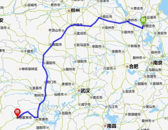 宿遷到張家界自駕車(chē)旅游線(xiàn)路(距離最短)